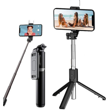 Selfie Stick + Trípode Extensible, diseñado para fotos y grabaciones de video con estabilidad total. Su altura ajustable hasta 0,70 m y rotación 360° permiten obtener el ángulo perfecto en cualquier toma.